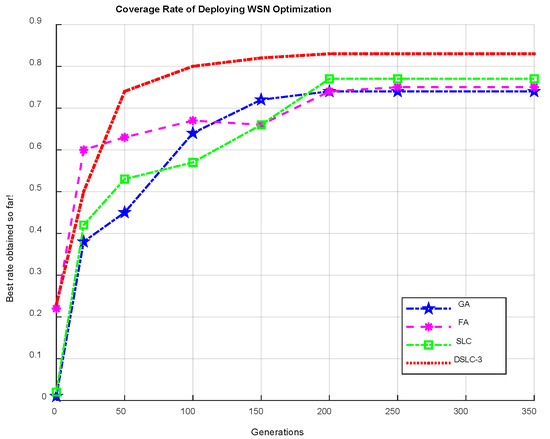 Comparison of the obtained coverage rate of the proposed DSLC-3 with the SLC. FA, and GA methods for the deployment WSN optimization.