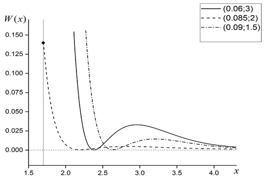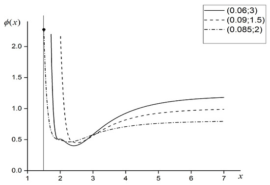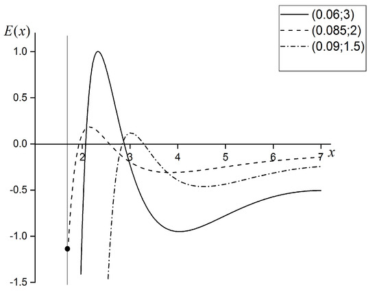 Typical profiles of the energy density scalar of the axion field (34). The basic profile has the typical fold-like structure: the minimum, the barrier on the left of the minimum, the maximum on its right-hand side. In the far zone the axion energy density tends to a constant, and the graphs have the horizontal asymptotes. The vertical line relates to the object boundary and defines the corresponding boundary value .