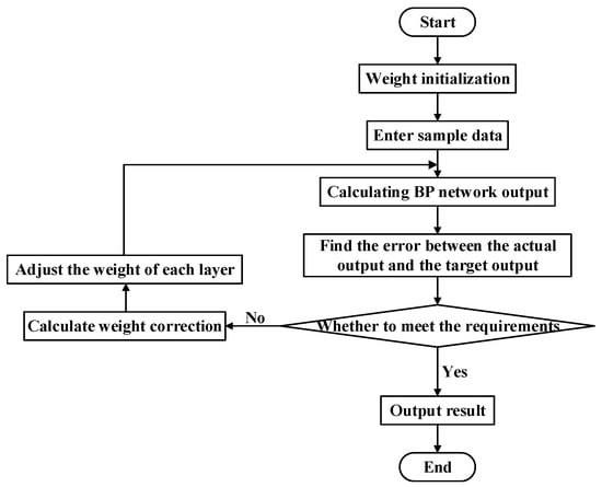 The training process of the BP neural network is shown in Figure 2. When the network structure is determined, the training of the BP neural network begins. BP neural network learning is composed of two processes: forward signal propagation and back error propagation. In the case of forward propagation, the input sample signal enters the network from the input layer and is finally transmitted to the output layer through hidden layer processing. If the output result is not consistent with the expected value, the error will be backpropagated and the weight will be adjusted according to the above weight adjustment coefficient until the output result of the network output layer meets the requirements.