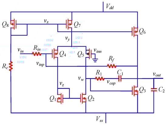 According to the theory of symmetry in electronic circuit research, a prototype tool C++ was developed to evaluate the accuracy and efficiency of our algorithm. The input of our tool is the circuit meshwork list in Simulation Program with ICEmphasis (HSPICE) format. The user-defined test input signal is a piecewise linear (PWL) signal source. The tool’s other level signal output can be used for the test circuit, with 100,000 iterations for each experiment. Each iteration includes a small HSPICE simulation with a duration of . The hardware selected in the experiment in this paper is equipped with four-core Central Processing Unit (CPU) 2.5GHz, 6 MB of L3 buffer memory and 16 GB of memory size, and there is no hyperthreading. The parameters and operational amplifier circuit used in the experiment are listed in Table 1, as shown in Figure 4.