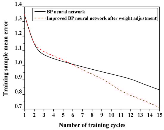 Figure 5 shows the average error comparison curve of the BP neural network and the BP neural network after weight adjustment and improvement in the training process. The downward slope of the curve represents the convergence rate of the training samples. The higher the slope of the curve, the faster the convergence rate, and the shorter the training time of the samples as the convergence rate increases []. With the increase in the training times of the samples, the average error becomes smaller and smaller, indicating that the weights of training samples tend towards the optimal weight vector, and the data fusion precision gradually improves. As shown in the figure, when the improved BP neural network data fusion algorithm based on weight adjustment is used, the sample converges faster in the training process and the training time of the sample can be shortened []. Although the average error of the samples of the BP neural network data fusion algorithm before and after the weight adjustment and improvement is the same at the beginning of the training, the average error value of the improved sample after 15 training sessions is close to 0.7, less than 0.8 before the algorithm improvement, indicating that the sample fusion accuracy under the improved algorithm is higher [].