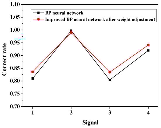 Figure 6 shows the accuracy of data fusion between the BP neural network and the BP neural network after weight adjustment and improvement. The higher the accuracy, the better the fusion effect. For the improved BP neural network fusion after weight adjustment, the fusion accuracy of each type of signal is higher than that before the improvement, and the data fusion effect is better.