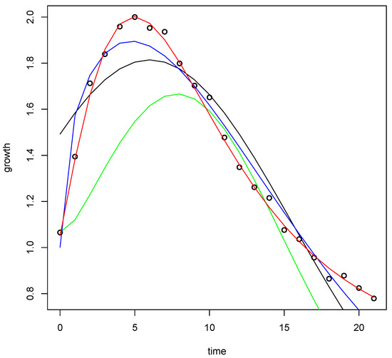 The real data on the alcohol concentration in blood appear in [32]. The adjustments corresponding to the observations (black line) associated with the alcohol concentration in blood are shown in Figure 2.