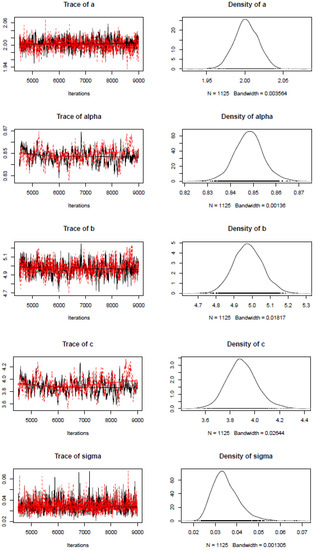 Figure 5 shows the trace and estimated posterior distributions of the parameters of interest using with ) fracional derivatives.