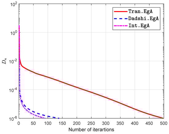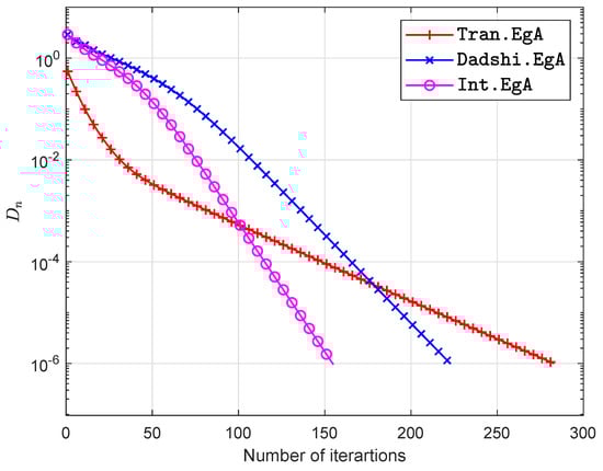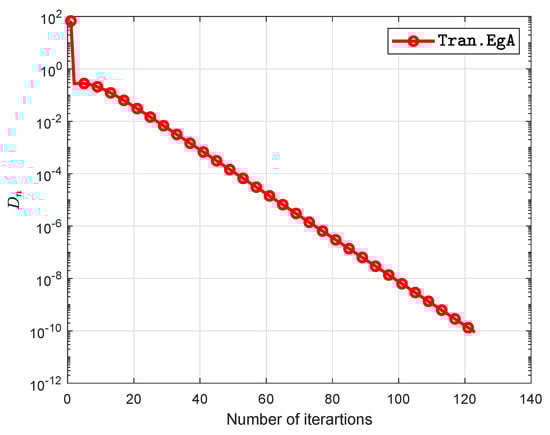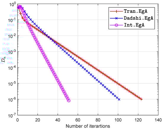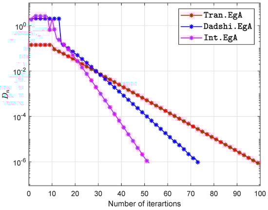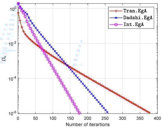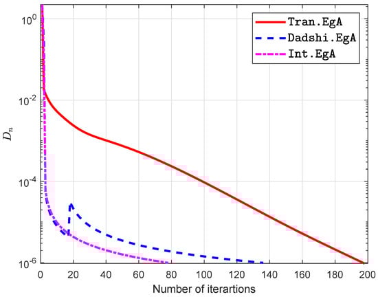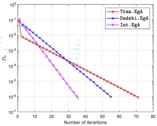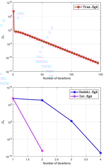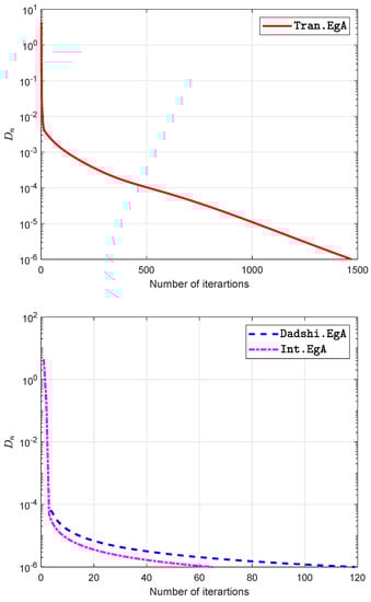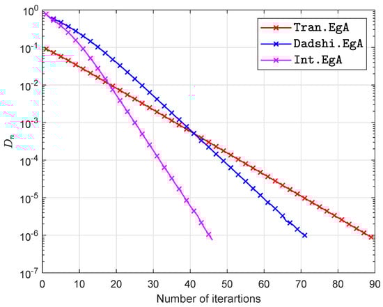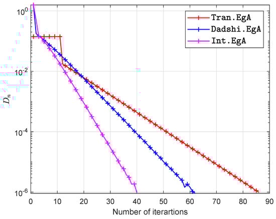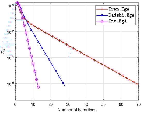 Some numerical results will be presented to show the efficiency of our above-mentioned methods. The MATLAB codes run in MATLAB version 9.5 (R2018b) on a PC Intel(R) Core(TM)i5-6200 CPU @ 2.30 GHz 2.40 GHz, RAM 8.00 GB. During all these examples we use and y-axes display error term while the x-axis refers to the total number of iterations or the running time (in seconds). Moreover, for our proposed Algorithm 1 (Shortly, Int.EgA) with error term and for Tran et al. [23] (Shortly, Tran.EgA) and Dadashi et al. [42] (Shortly, Dadshi.EgA) with error term