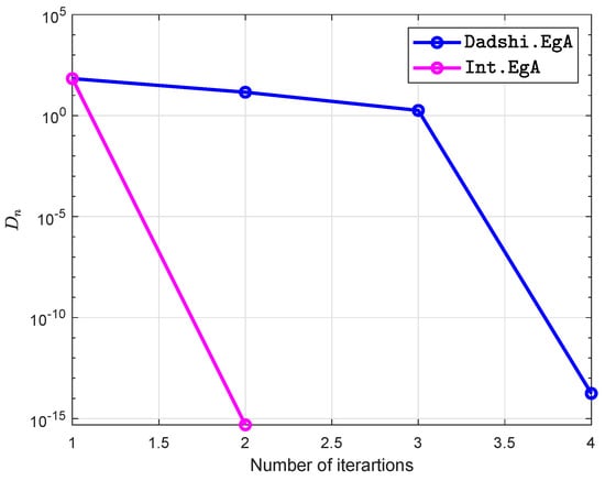 while A is matrix and b is nonnegative vector. We can see that bifunction is monotone with Lipschitz-type constants are The numerical findings shall be noted in Figure 9, Figure 10 and Figure 11 and Table 3 with and