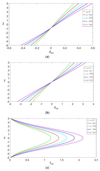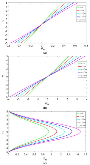 Variation with the nonlocal parameter of the dimensionless axial stress (a), longitudinal shear stress (b), and transverse shear stress (c) through the thickness of shallow spherical panels with .