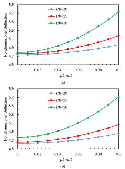 Figure 3 also shows the combined effect of the nonlocal parameter, , and side-to-thickness ratio, , on the deflection response of thin spherical (Figure 3a) and cylindrical (Figure 3b) panels. In both cases, an increased non-local parameter clearly yields a monotonic increase in deflection for each fixed ratio. The deflection also increases for a decreased geometrical ratio, while keeping the nonlocal parameter fixed due to an overall stiffness reduction. Based on a comparative evaluation of the curves in Figure 3a,b under the same assumptions for and , the spherical panels seem to be more flexible than the cylindrical panels due to the higher deflections registered for the first geometry. This is in line with the well-known size-dependence of the mechanical properties for small-scaled structures and nanoelectromechanical systems (NEMS), as largely observed in many experimental investigations and atomistic simulations in literature.