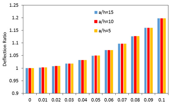 In the histograms of Figure 10, we quantify the effect of the nonlocal parameter and side-to-thickness ratio, , on the deflection ratio of the deep spherical panel under a uniform load. Based on Figure 10, please note that the side-to-thickness ratio does not significantly affect the deflection ratio of the deep spherical panel, independently of the nonlocal parameter, where the only variation in deformability is related to the nonlocal parameter. This justifies the necessity of applying a nonlocal theory instead of the classical elastic ones, which could underestimate the deformability of a nanostructure, in agreement with findings from References [12,13,14].