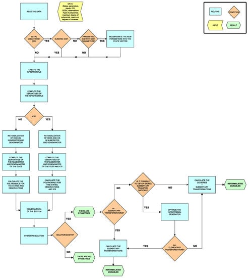 The code consists of a main MATLAB script, ‘Lie_Symmetry’, and ten auxiliary functions defined in separate files. Each of these functions performs one of the stages outlined above: calculation of infinitesimal polynomials (univariate, partially variate and multivariate); computation of polynomials for states (depending on the type of polynomial there are two possibilities), observations, and ICS (if they are specified); and obtaining the transformations. The last step in turn incorporates two other functions, corresponding to maximizing the number of elementary transformations and, if necessary, calculating the transformations using Lie series.