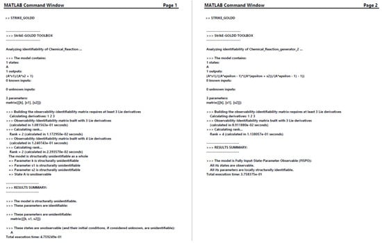When compared to other applications, biological models often pose specific challenges due to the combination of nonlinearity, uncertainty about the underlying system, and experimental limitations regarding the possibility of perturbations and of measurements [1]. These features make the identification of biological models particularly challenging, and call for new methodological developments and computational tools. Indeed, many theoretical advances in nonlinear systems identification have been motivated by biological problems, even though the type of problems being considered are often common to other scientific areas, which makes the resulting methodologies generally applicable [2,3]. An example is the study of structural identifiability, a property that was introduced in the context of physiological modelling [4] and has since then been adopted in many scientific and technological areas; since its study is of particular interest for biological models, many related theoretical developments have been motivated by biological problems [5,6,7]. Structural identifiability refers to the possibility of inferring the values of the unknown (constant) parameters in the model equations from observations (measurements) of the model output. It is closely related to—and in fact can be considered a particular case of—another property, observability, which describes the possibility of determining the (time-varying) state variables of the model [8]. By considering the parameters as constant state variables, structural (local) identifiability amounts to observability (In accordance with the usual terminology, we speak of structural identifiability to distinguish it from practical identifiability. The latter quantifies the uncertainty in parameter values taking into account the information content of the available data, which may be limited due to experimental errors or low sampling rates. We also specify that it is structural local identifiability to distinguish it from structural global identifiability. Although observability is also a structural local property, for historical reasons we do not add those adjectives to its name, and refer to it simply as observability.).
