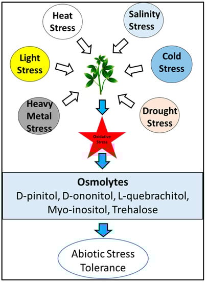 Schematic representation of the plant’s response to various abiotic stresses and the role of osmolytes under stressful conditions [44].