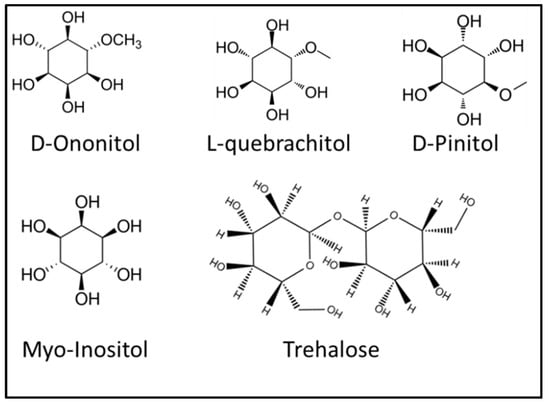 Osmolytes including carbohydrate are other neutral molecules that protect plants under various stress factors [37]. These metabolites include proline, sucrose, polyols, and trehalose (Figure 1), and they protect the plant under stress conditions by conserving the cellular function of plant. Many reports have suggested the role of osmolytes in drought [38], predator, and pesticide stress [39,40,41] Figure 2 represents the structure of some osmolytes. Accumulation of myo-inositol indicates membrane disintegration due to air pollution [42]. Pectic polysaccharide mucilage plays an important role in plant tolerance to salinity stress when it increases in stems, shoots, and roots with increased uronic acid and rhamnose [43]. Furthermore, flavonoid and chitinase gene expression are plant defense mechanism responses to insect herbivory [35]. Cyanogenic glycosides, a secondary metabolite of the plant, is composed of alpha-hydroxy nitrile and D-glucose moiety; these compounds are potentially dangerous to animals and humans due to the presence of hydrogen cyanide (HCN). Release of such substances occurs spontaneously or through enzymatic regulation by the plant.