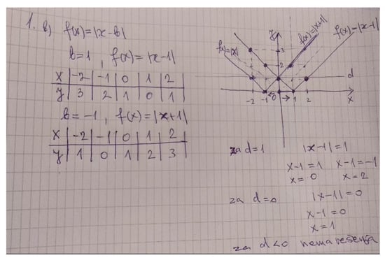 In the first task, the translation of the graph of absolute value functions was checked. Translations are considered as a transformation that shifts a graph horizontally or vertically, but does not change the overall shape or orientation. The students’ task was to find the algebraic equation based on the graph of linear and quadratic absolute value functions and vice versa.