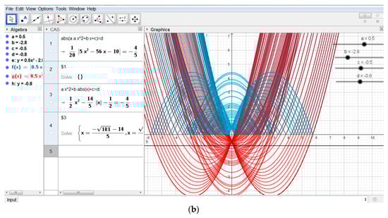 Student A from the experimental group solved the same task using the Slider option in GeoGebra software. The selected parameter values were and , which was greater than the student from the control group (Figure 3). The student assigned the different colors for the graphs of the function. This made it easier for him to keep track of the appropriate algebraic and graphical representations in view (by color).