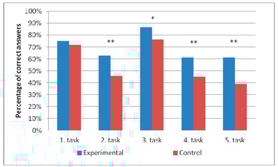 Each task was worth six points. The student could score a maximum of 30 points in the pre-test and 30 points in the test of knowledge. The pre-test was organized as part of the initial testing at the beginning of the school year. The knowledge post-test was organized as a part of the preliminary examination.