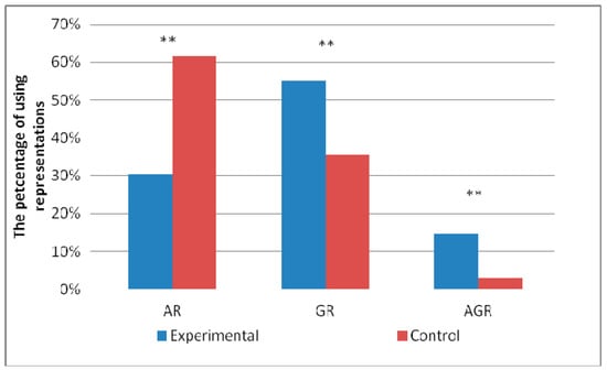 In mathematical education, multiple representations are defined as the presentation of mathematical relations in different ways [26]. Representations are divided into internal, mental constructions, or external objects such as tables, graphs, algebraic expressions, mathematical equations, geometric figures, etc. [27]. There is a two-way interaction between these representations. The extent and level of students’ knowledge depend on the quantity and quality of relationships between internal and external representations [27,28]. Students’ errors are usually explained either as a product of a poor handling of representations or a lack of coordination between the two representations [29]. When it comes to learning, the use of the different multiple representations contributes to the resolution of intrinsic ambiguities within the representation system [30].
