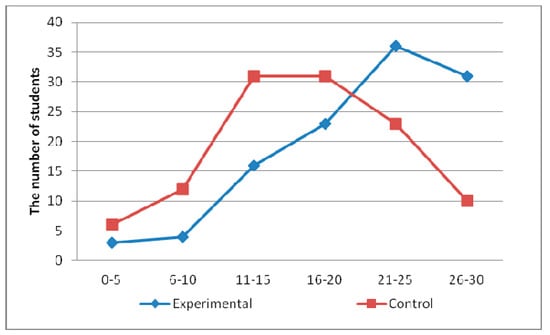 At the beginning of the experiment, all students were pre-tested, where their previous knowledge of linear and quadratic absolute value functions and absolute value equations was checked (Appendix A). The duration of the pre-test was 90 min. The students’ results from both groups in the pre-test were analyzed and compared. Each student in the control group had a pair in the experimental group whose number of points did not differ by more than two, according to the pre-test results [64]. For this reason, the number of students in both groups was 113 students, 226 in total, and the other 26 students who were tested did not have a pair and were not taken into account in this assessment. The difference between the groups was not statistically significant, with the significance level of 0.05.
