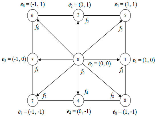 The numerical technique lattice Boltzmann method (LBM) is an effective approach used to solve complex fluid problems, either those single or multiphase flows, and will be used here to solve this problem [17,18]. This numerical technique has several merits as compared to other techniques, such as the finite volume or finite element methods. For example, the streaming and collisions are local in nature, which provide an opportunity for parallel computing [18]. It is explicit in nature and the non-linear term in the Navier-Stokes equation [18] can easily be handled through this method. It is second-order accurate in both space and time [19,20]. In this technique, the pressure is calculated through the equation of state. The model used here is the two-dimensional nine particles (D2Q9) velocity model (Figure 1). The general form of the Boltzmann transport equation is:
