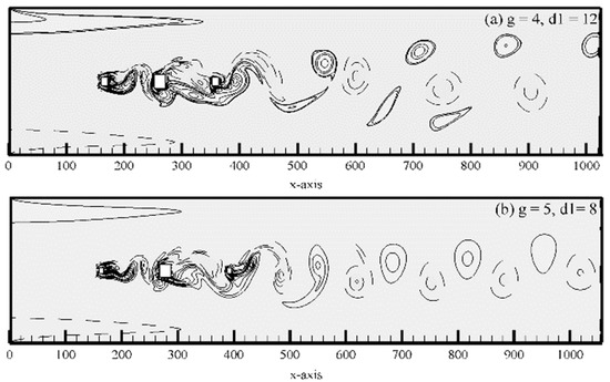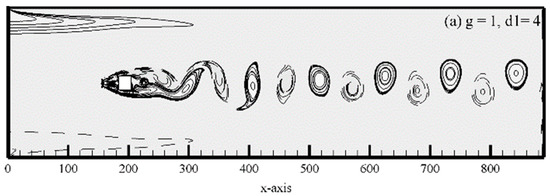 The first flow mode was observed at a small gap spacing that was g = 1 to 2, while the size of the control rod was d1 = 4 (see Figure 3a,b). Due to the small space, no flow passed between the gaps and the shear layers transformed from the upstream control rod rolled up to form vortices in the region of the downstream control rod only (Figure 3a,b). The triad of rods behave like an isolated body in the flow field and this flow mode is named as single bluff body flow mode. The shed vortices move in an alternate manner towards the downstream location of the channel. It is clear from Figure 3a,b that shed vortices remain distinct throughout the channel after detaching from the main rod and two small control rods. When g is increased from g = 1 to 2, the strength of the generated vortices decreases while the length of shear layer increases. This flow mode was also examined by Zdravkovich [28] at gap spacing within the range g = 1–1.8 and Malekzadeh and Sohankar [5] at h/w = 0.1 (where h is length and w is width of the control plate) for g = 1.1–5 at Re = 160.