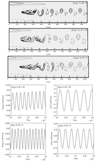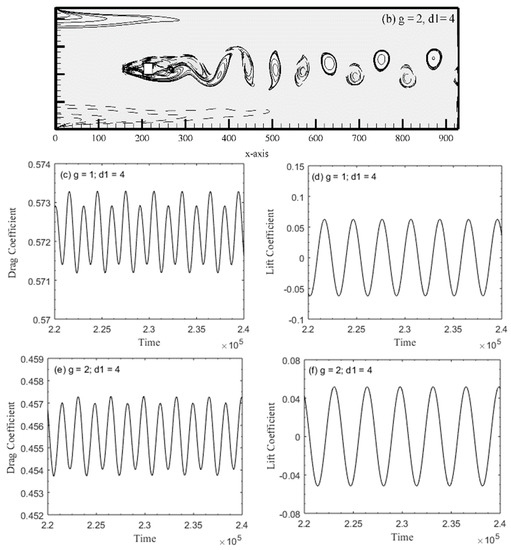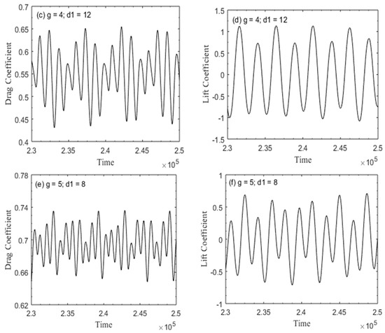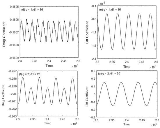 In Figure 5d–g the time signal analysis of Cd and Cl for RSLR flow mode was presented at (g, d1) = (4, 16) and (5, 4). It can be seen from the figure that for both cases the drag and lift coefficient show periodic behavior. The amplitude of drag force increases with increments in gap spacing from g = 4 to 5 and by decreasing the size of the control rod from d1 = 16 to 4. Yet this trend reverses in case of lift coefficient; this is because as the size of control rods decreases, the strength of vortices increases, which enhances the magnitude of the drag coefficient.