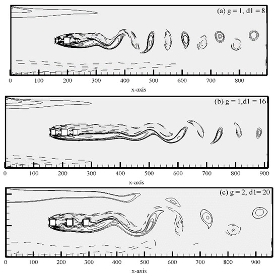 The second flow mode was observed at (g, d1) = (1, 8), (1, 16), (1, 20), (2, 8), and (2, 20). Here we only discuss the cases (g, d1) = (1, 8), (1, 16), and (2, 20) (see Figure 4a,b). As the gap spacing and size of both the control rods are changed, the flow behaves very differently, and it is no longer SBB flow mode. The shear layer emerges from upstream and the control rod reattaches to the main rod and control rod directly at downstream location without rolling up in the gap between the main rod and downstream control rod. The length of the shear layer at the downstream wake region decreases as g and d1 increase (see Figure 4a,b). It is clear from the vorticity plots of WSLR flow mode that the shear layer detaching from the upstream control rod moves without roll up in the gaps and vortices formed at downstream position of the computational domain (see Figure 4a,b). When the size of the control rods is equal to the size of the main rod then the three in-line square rods shed scattered vortices (Figure 4c).