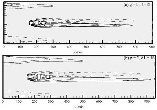 The fourth flow mode was observed at (g, d1) = (1, 12), (2, 12), and (2, 16). The vorticity contours of steady flow mode are shown in Figure 6a,b. From Figure 6a,b it is clear that the shear layer emerging from the upstream control rod did not reattach to the main rod as well as the downstream control rod and moved in a similar manner throughout the computational domain. As a result, steady flow behavior was observed and there was no vortex formation. On the basis of these facts, this flow mode is named as steady flow. Due to steady flow the drag and lift coefficient graphs are a straight line (not shown). The straight line for drag coefficient is evidence that there was no formation of vortices. Vamsee et al. [12] found SF behavior for the case of detached dual plates by considering the fixed length of upstream control plate at 1d.