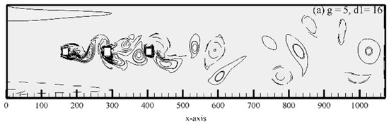 The third existing flow mode is called rolled up shear layer reattachment (RSLR) flow mode, that was investigated at (g, d1) = (3, 4), (4, 16), and (5, 4) (see Figure 5a–c). It was noticed that when the gap increased from g = 2 to 5 for different sizes of control rods, then fluid entered in both gaps. The generated shear layer from the upstream control rod rolled up completely but the complete formation of vortices between the gaps does not exist (Figure 5a–c). It can be seen from Figure 5a–c that the shed vortices are observed only at the downstream location of the channel and the strength of shed vortices for small size of control rods (i.e., d1 = 4 is maximum as compared to d1 = 16 for g = 4). This flow mode is also observed at (g, d1) = (3, 12), (3, 16), (3, 20), (4, 4), and (4, 20). Igarashi and Suzuki [29] also investigated this flow behavior and named this mode as with reattachment and roll up flow for three circular rods. This kind of flow mode was also found by Islam et al. [13] for flow past a square rod with a detached control plate.