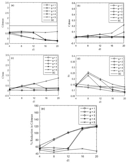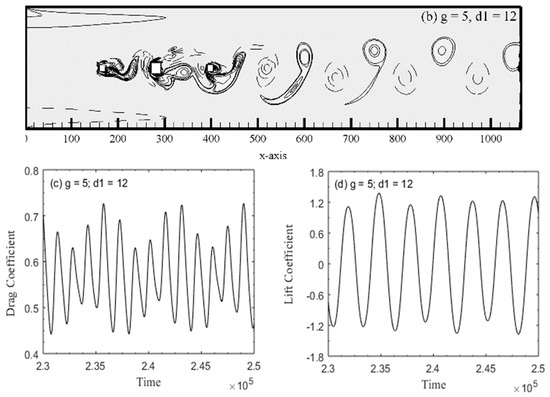 The Strouhal number, which indicates the primary vortex shedding frequency is shown in Figure 10d as a function of d1 for various g. It is clear from the figure that the St values of a single rod without a control rod are smaller than the St values of a main rod detached with controlling rods. The Strouhal number attains its local minimum value of 0.0787 investigated at (g, d1) = (2, 20), where WSLR flow mode was observed and local maximum value of 0.2571 at (g, d1) = (5, 8), where existing flow mode fully developed into vortex shedding flow mode. The St values for g = 3, 4, and 5, first increase then start decreasing with an increase in values of control rod size, but for g = 1 and 2, St continually decreases.
