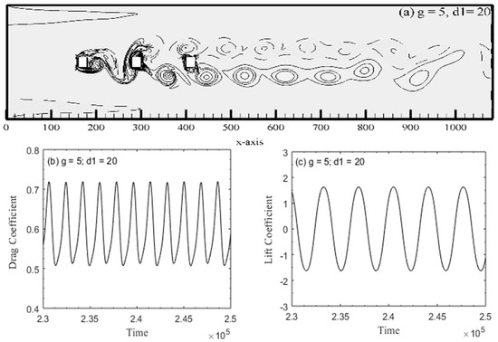 The last existing flow mode was named as two rows vortex street (TRVS) flow mode observed at (g, d1) = (5, 20). At this gap spacing and size of control rods, the flow finds enough space within the gaps for the complete development of vortices. In this flow mode the vortices move in a double row towards downstream of the computational domain. From Figure 9a, it can be seen that the shear layer separated from the upstream control rod and the middle main rod rolls up to form vortices between the gaps. These vortices are converted in two rows after interacting with the downstream control rod. Figure 9b,c shows the time signal analysis of Cd and Cl for two rows vortex street flow mode. It is clear from the figure that both the drag and lift graphs exhibit periodic behavior. Similarly, two rows vortex street flow mode was also reported by Islam et al. [32] for flow over three tandem square rods at g ≥ 5.