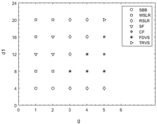 The percentage reduction in Cdmean against the size of the control rod for gap spacing g = 1–5 is shown in Figure 10e. It is deduced from the figure that the percentage reduction of Cdmean curves show increasing behavior at g = 1 and 2 for all sizes of control rods but with a mixed trend for the remaining values of gap spacing. This indicates that maximum reduction in drag is observed at the smallest values of gap spacing. The minimum reduction of 43.6% is examined at (g, d1) = (5, 8). This is due to the fact that at large g, the effect of the control rod diminishes. The maximum percentage reduction of 121% in drag force is observed (g, d1) = (2, 20), where without rolled up shear layer flow mode is characterized. The maximum reduction in Cdmean confirms that the maximum size of both upstream and downstream control rod reduces more drag force at small gap spacing as compared to the smaller size of control rods and without rolled up shear layer flow mode is an ideal flow mode for the present numerical investigation. The complete details of all existing flow modes are shown in Figure 11.
