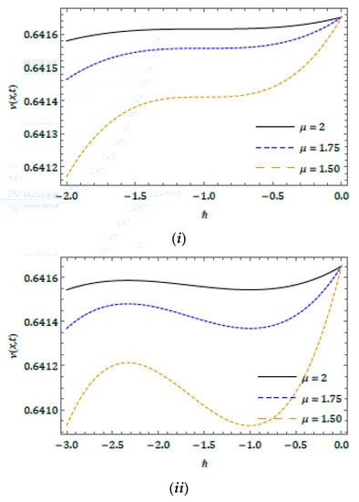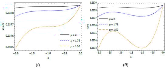 Here, we have demonstrated the numerical simulations of the Phi-four equation having fractional-order by using -HATM. The fourth order solution (i.e., up to ) we consider to illustrate the behavior of the obtained solution in terms of plots and tables. In Table 1 and Table 2, the numerical studies have been conducted to ensure the exactness of the projected algorithm, and further from the tables, it is confirmed that the considered model conspicuously depends on the time. The surfaces of the -HATM solution, exact solution and absolute error are captured in Figure 1 for the FPF equation considered in Example 1. To show the projected problem remarkably depends on arbitrary order and the response of -HATM solution for different , the plots have been drowned and are cited in Figure 2 and Figure 5 for Examples 1 and 2., respectively. Similarly, nature obtained and exact solutions in association with absolute error for Example 2, are presented in Figure 4. The -curves have been drowned to analyze the behavior of the achieved solution related homotopy parameter with different for both examples and have been respectively captured in Figure 3 and Figure 6. These curves can help us to adjust and regulate the region of convergence for the -HATM solution. For unsuitable , the -HATM solution swiftly converges to exact solution. The demonstrated plots help us to better understand the nature of the fractional Phi-four equation when temporal-spatial variables vary in comparison with arbitrary order.