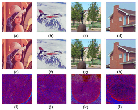 Figure 3. Host images (a) Lena, (b) F16, (c) TTU, and (d) House; watermarked images (e) Lena, (f) F16, (g) TTU, and (h) House; difference between host images and watermarked images: (il).