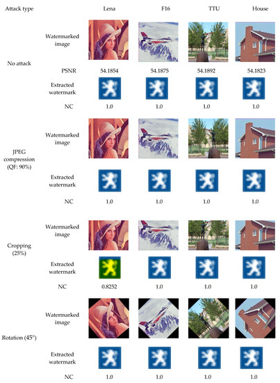 15. Su, Q.; Niu, Y.; Wang, G.; Jia, S.; Yue, J. Color image blind watermarking scheme based on QR decomposition. Signal Process. 2014, 94, 219–235. [Google Scholar] [CrossRef]