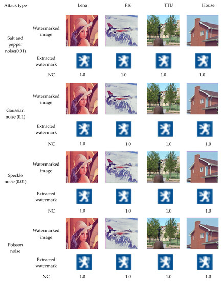 • Gaussian noise: the watermarked images were attacked by Gaussian noise with variance 0.1;