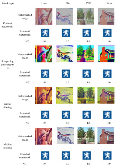 Figure 7. Analysis of the proposed method under contrast adjustment, sharpening (0.1), wiener filtering, and median filtering attacks.