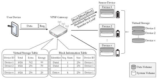 The VPSF gateway builds virtual storage by logically integrating the extra data volumes of the multiple sensor devices and manages it by maintaining a virtual storage table (VST) containing the total amount of extra data volumes of all sensor devices in the network and the information of each sensor device (device ID, extra data volume size, and residual energy). For storing data, the VPSF gateway divides the user data into several blocks and selects the sensor devices in which the blocks will be stored based on their residual energy. Then, the VPSF gateway forwards the blocks to the selected sensor devices and maintains a block information table (BIT) containing the information of the stored blocks (original user data identifier, block sequence number, block size, and device ID of the sensor device where the block is stored). The selected sensor device stores only the information contained in the payload of the blocks in binary format. For data retrieval, upon receiving the retrieval request message, the VPSF gateway checks the identifier of the requested data and then searches the BIT to find the device ID of sensor devices where the blocks for the requested data are stored. It then requests the blocks of the corresponding sensor devices in order of sequence number. After the VPSF gateway obtains all blocks, it integrates them into a single data set and transmits the integrated data to the user device.