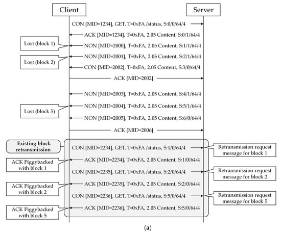 Figure 2 illustrates an operational example of the existing and modified BlockS option of the CoAP. MID is the message ID, T is the token, and S is the value of the BlockS option (the sequence number of the blocks, whether more blocks are following, the size of the block, and SPDYWND). In the example, the size of the block is set to 64 B, and SPDYWND is set to 4. The example demonstrates that the modified protocol reduces communication overhead by eliminating retransmission request messages.