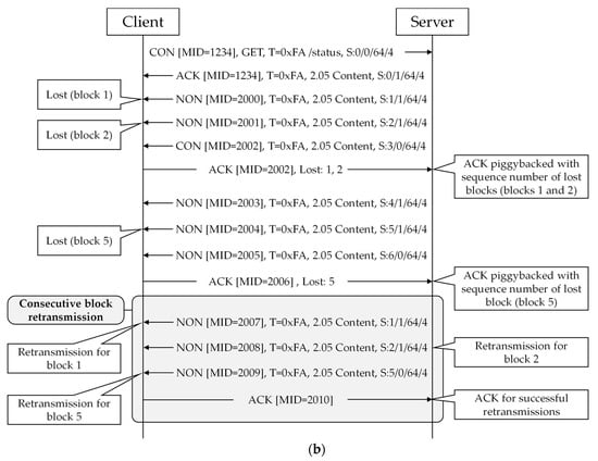 Comparison of two operational examples: (a) existing speedy block-wise transfer in CoAP; (b) modified speedy block-wise transfer in CoAP.