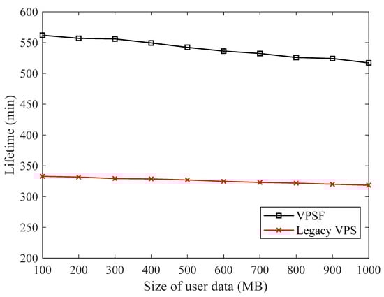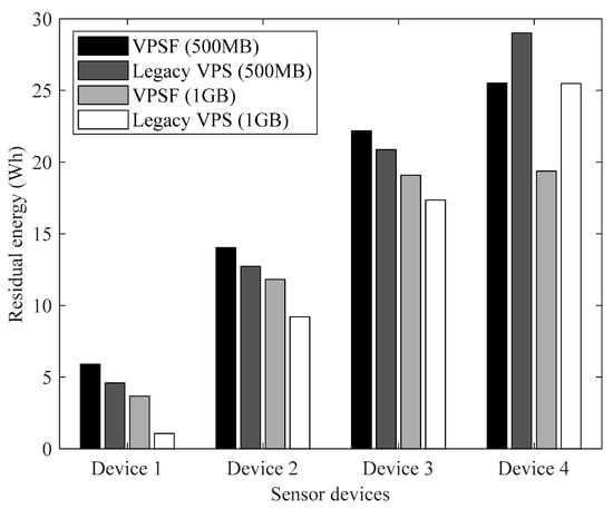 The higher the fairness index, the smaller the difference in residual energy. Table 2 lists the fairness index of the VPSF and legacy VPS for each case. For 500 MB and 1 GB, respectively, the VPSF exhibited 7.58% and 19.77% higher fairness indexes than legacy VPS.