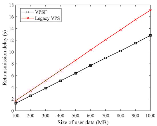 Figure 6 depicts the variance in retransmission delay per user data when the size of user data changes. During the experiment, the block delivery ratio was 92.1%, on average, and 7.9% of blocks were lost and retransmitted. The VPSF employed the modified BlockS option, which enabled the server (VPSF gateway) to consecutively retransmit the lost blocks. The retransmission delay of the VPSF was 25.6% shorter than that of legacy VPS, on average. During the experiment, the retransmission delay increased as the size of user data increased—the larger the size of the user data, the higher the number of lost blocks.