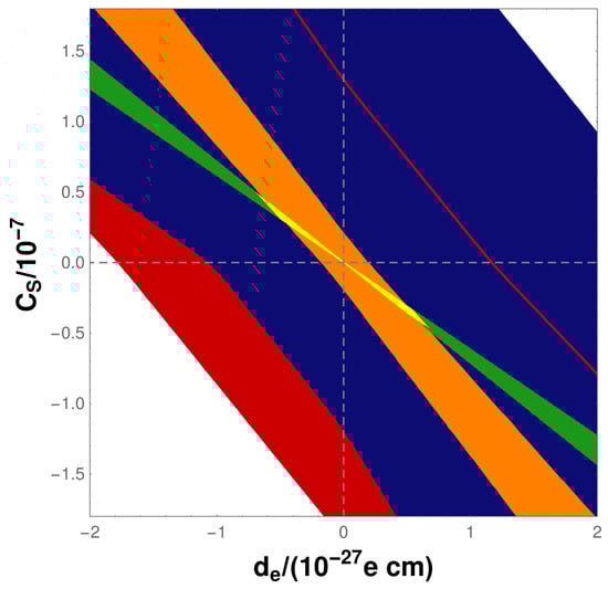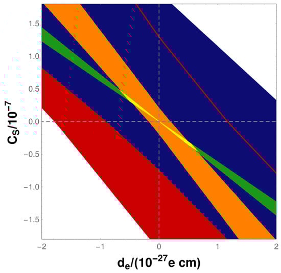 Open-shell atomic and molecular systems are particularly sensitive probes of leptonic and semi-leptonic -violation [10]. In most BSM models [11] the dominant -odd sources are the electron EDM, , and the nucleon–electron scalar-pseudoscalar (Ne-SPS) coupling, . Figure 1 (Courtesy: Martin Jung, Torino, Italy (2019)) shows the constraints (yellow surface) on and using the combined information from measurements [3,12,13,14] and calculations [4,5,15,16,17,18,19,20,21,22,23], including the associated experimental and theoretical uncertainties, on the open-shell systems ThO (green), YbF (red; the red surface underlies the others and its extent is indicated by the thin red line), HfF (orange) and Tl (blue) through a global fit in the / plane. Results from a single system do, therefore, not constrain or individually at all in this multiple-source interpretation [24], but lead to a fan-shaped surface of allowed combinations. The width of this surface is a function of the experimental and theoretical uncertainties.