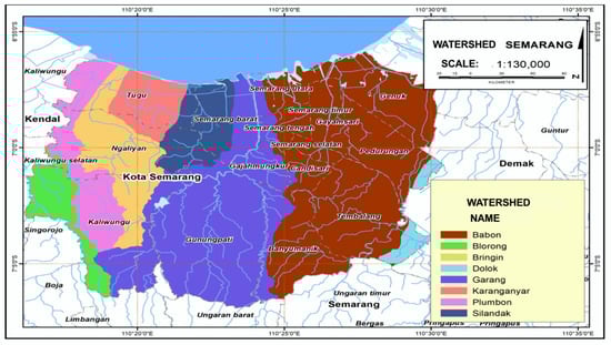 This study was conducted in Semarang City, which is surrounded by five watersheds—namely Garang, Bringin, Karanganyar, Silandak, and Babon Pemali Jratun watershed (Center for Watershed and Protected Forest Management (BPDASHL)). The details can be seen in Figure 2 as follows.