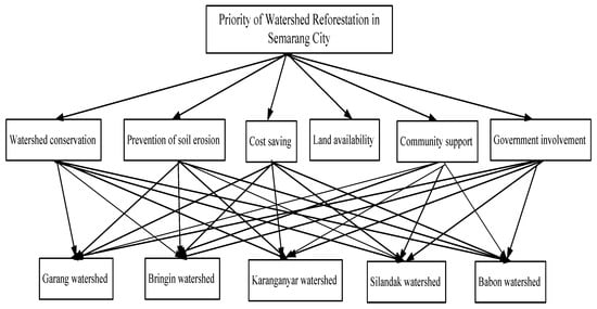 According to Liu [], hierarchical structure is a step to define the problem in a clearer and more detailed form. The hierarchical structure is arranged based on the views of experts in the concerned field. The top level in the hierarchical structure is the goal of the decision, the middle level is the criteria, while the lowest level is an alternative for decision. The arrangement of the hierarchical structure can be described in Figure 3. The hierarchical structure of the decision-making process applied in the watersheds in Semarang City, Central Java, Indonesia is as follows.
