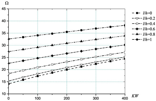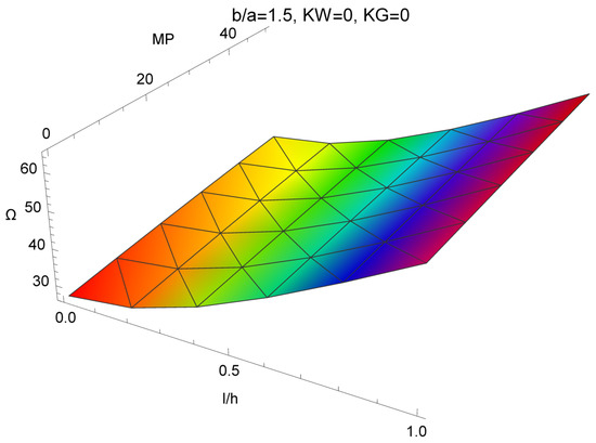 For a rectangular plate with mechanical properties (32) and , the effect of magnetic field was investigated versus the thickness ratio . The results are presented for plates with all simply supported edges (Figure 2) and clamped edges (Figure 3). In both cases, it can be seen an increase in the dimensionless frequency (30), with an increase of both: the magnetic parameter as well as the material length scale parameter. The similar influence of the magnetic field was reported in [31,32] based on the nonlocal elasticity theory for simply supported boundary conditions. The largest values of frequency parameter are characteristic of the plate with clamped edges. Herewith an increase within the magnetic parameter leads to a decrease in the difference in the results between the classical and the modified couple stress theory. Thus, inter-atomic bonds of the micro/nanoplates influence the vibration behaviour less for higher values of the magnetic field strength.