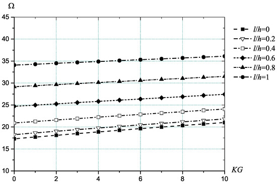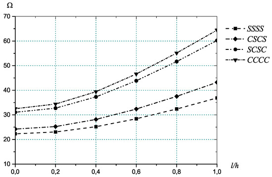 To study the effect of the elastic foundation using the Winkler-type model, the Winkler modulus parameter is taken within the range of as in [23,25]. The results are presented for the thickness ratio , , and simply supported boundary conditions (Figure 4). Analysing the results it can be noticed that by an increase of the Winkler modulus, the value of the frequency increases for all values of and the difference in results from the classical theory becomes smaller. Taking the shear modulus factor in the range 0–10 [23,25], we studied influence of the Pasternak-type foundation on the vibration frequency parameter (Figure 5). Calculations are performed by varying for fixed , . Obtained results show an increase of the dimensionless frequency with an increase of the shear modulus. The small scale effect was investigated, changing the type of boundary conditions (Figure 6). Here four types of symmetrical boundary conditions are considered: SSSS, CCCC, CSCS ( are clamped, are simply supported), SCSC ( are simply supported, are clamped). The graphene sheet is exposed to the magnetic field with the magnetic parameter . We also consider that the Winkler modulus and the shear modulus of the surrounding elastic medium equal to 100 and 10, respectively. Analysis of results allows concluding that an increase in the clamped part of the boundary implies an increase in the frequency value and the greatest values are reached under CCCC boundary conditions. The difference in the results with an increase in the thickness ratio is more significant for clamped boundary conditions.