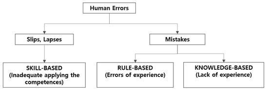 The magnitude of marine accidents is considerable; therefore, their possible causes must be assessed []. Human errors must be considered the greatest risk [] because they are related to a majority of marine accidents (75%–96%) []. Several researchers have investigated methods to reduce human errors, which requires a clear understanding of human behavior []. The US Navy’s aircraft carriers, nuclear power plants, and organizations such as air traffic control centers have experienced difficulties in reducing human errors []. For example, research has been conducted to divide workers’ behavior based on skills, rules, and knowledge to reduce human errors in nuclear power plants [].