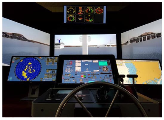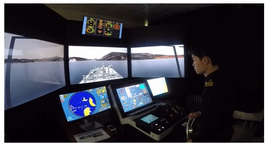 Using a real environment experiment is difficult because of both time and cost. Therefore, the proposed simulator was used as an alternative [,]. The equipment used herein was a ship-handling simulator from Kongsberg, Norway; it was installed by Kongsberg Korea as an experimental equipment at Mokpo Maritime University. Its configuration is shown in Figure 2. For this study, a telegraph to control the speed of the ship, a wheel to change the direction of the ship, a radar for navigational aid, and an electronic chart display and information system (ECDIS) were included. We implemented a large-screen virtual reality training session and displayed navigation information on speed and rate of turn. The visual monitor was displayed at 160° ahead, thus allowing the user to control the visible background. Moreover, a video recorder was installed to record the operation of the interface, such as participants’ behaviors and navigation devices, to reevaluate participants’ behaviors using the recorded screen in the event of any doubt on their behavior evaluation. Mokpo Port in South Korea was selected as a simulation site because most participants have visited it at least ten times; therefore, they were familiar with the place. For this study, all the dynamic data of the ship during navigation were stored by the instructor.