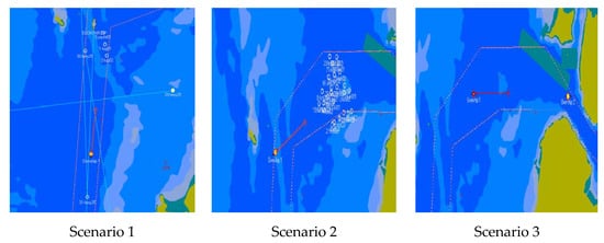 For this study, the autopilot mode was used; therefore, the bridge team comprised a navigator solo watch. Because the ship-handling simulator was separately installed, the experiment was repeated for three consecutive weeks owing to the number of participants and individually observing the progress over three weeks. Furthermore, the bridge team normally consists of skillful captain and navigator, but in this experiment, a solo watch was used to measure the errors of navigators. The participants were trained on the core of the experiment and scenario. Then, the familiarization process with the ship-handling simulator was conducted and they became familiar with the maneuvering and various interfaces of the simulators. Because familiarization with ship-handling simulators was important for measuring SBS [], 15 min were allowed for familiarization with the interface, radar, ECDIS, and navigation equipment despite their prior 80-hour simulation experience. After the familiarization process was completed, the experiment was conducted by applying three collision scenarios, as shown in Table 1 and Figure 3. The participants were asked to write their action plan to avoid a collision for each scenario. Because planning is a crucial factor for measuring their KBMs [], the plan had to be prepared in detail. The results of the written action plan were then used to evaluate the KBMs.