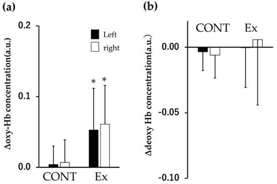 Bar graphs of near-infrared spectroscopy (NIRS)-defined oxyhemoglobin and deoxyhemoglobin levels. (a) Oxyhemoglobin concentration during experimental and control tasks. (b) deoxyhemoglobin concentration during experimental and control tasks. n = 26, mean ± SD, * p < 0.001 (experimental task vs. control task; Scheffe’s test). Control (CONT); experimental (EX).